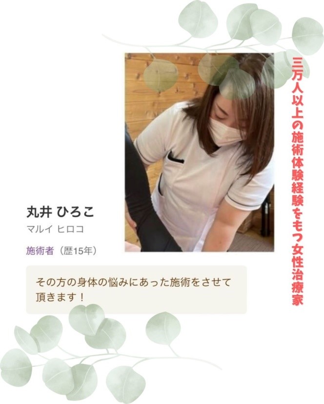 3万人以上の施術体験経験をもつ女性治療家。猫背・姿勢改善・骨盤矯正・産後ケア・ダイエット・インナーマッスル強化にアプローチします。