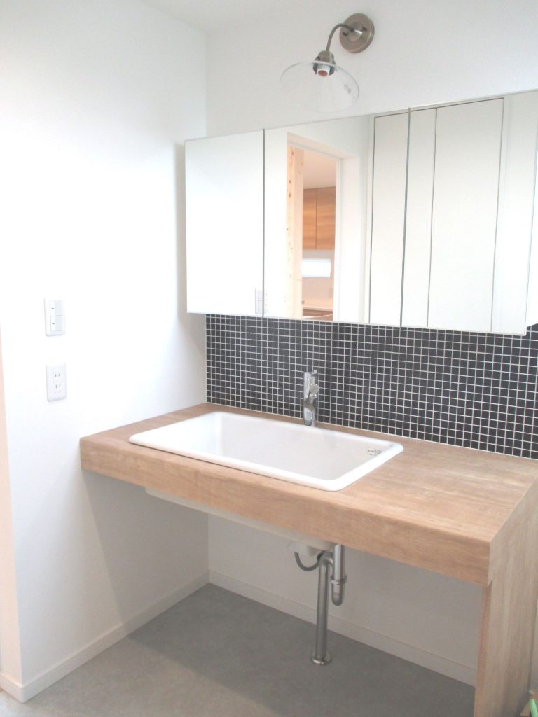 広いカウンターと鏡が使いやすい造作洗面台は奥様のご希望。濃い色味のモザイクタイルがおしゃれです。