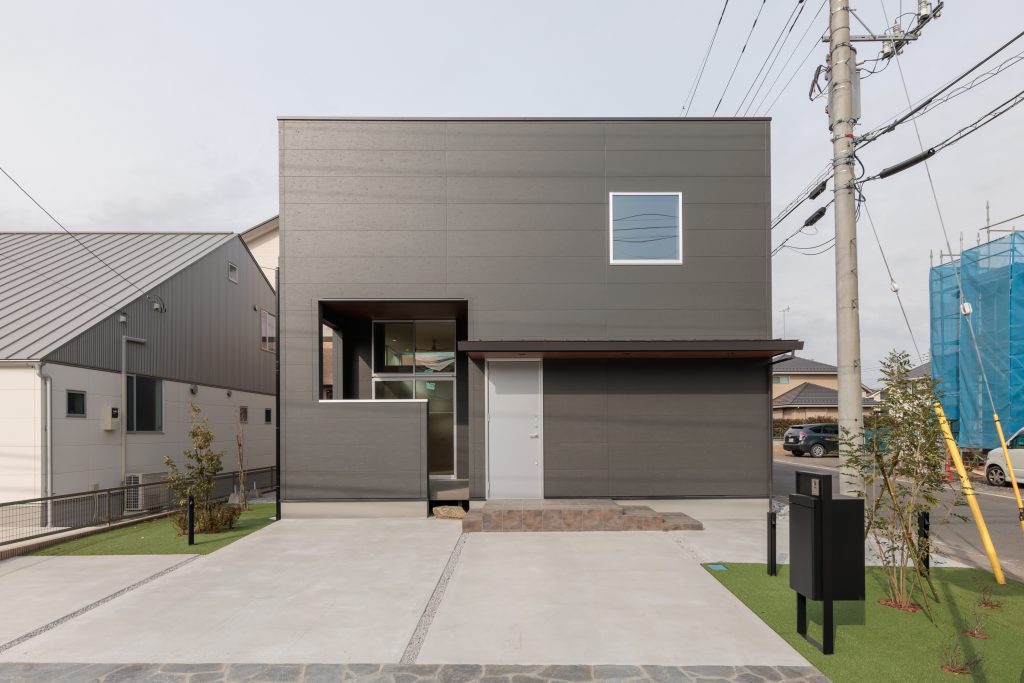 外観は、四角い外形を無地の外壁材で仕上げました。スタイリッシュな外観に部分的に木目を使い、少し優しいおしゃれな雰囲気。天井の高いインナーテラスも立面に特徴を与えています。薄くて出幅の大きい庇もカッコイイ。